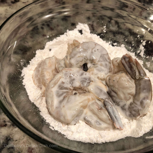Drain the excess and toss the shrimp in the flour. Coat well and prepare to fry.