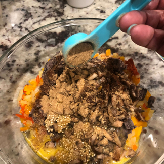 Chop the onion, yellow, and red peppers and cook them in a pan with vegan butter until they are tender. Add in the chopped mushrooms allow them to cook down, and set them to the side.
