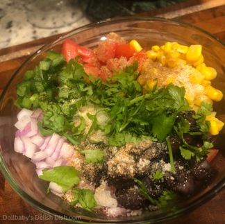 Chop the red onion, white onion, jalepeno pepper, and roma tomatoes and place them in a bowl with the black beans that you rinsed and corn.