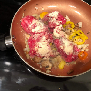 last to the pan is the steak and the remaining seasonings. Garlic and onion powder. Cook until the meat is done. Time to assemble!